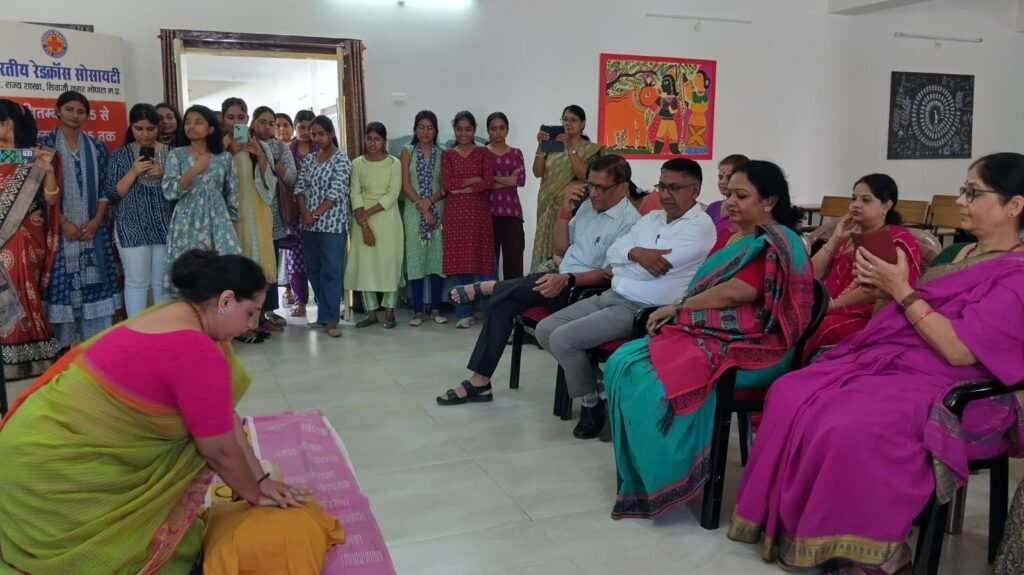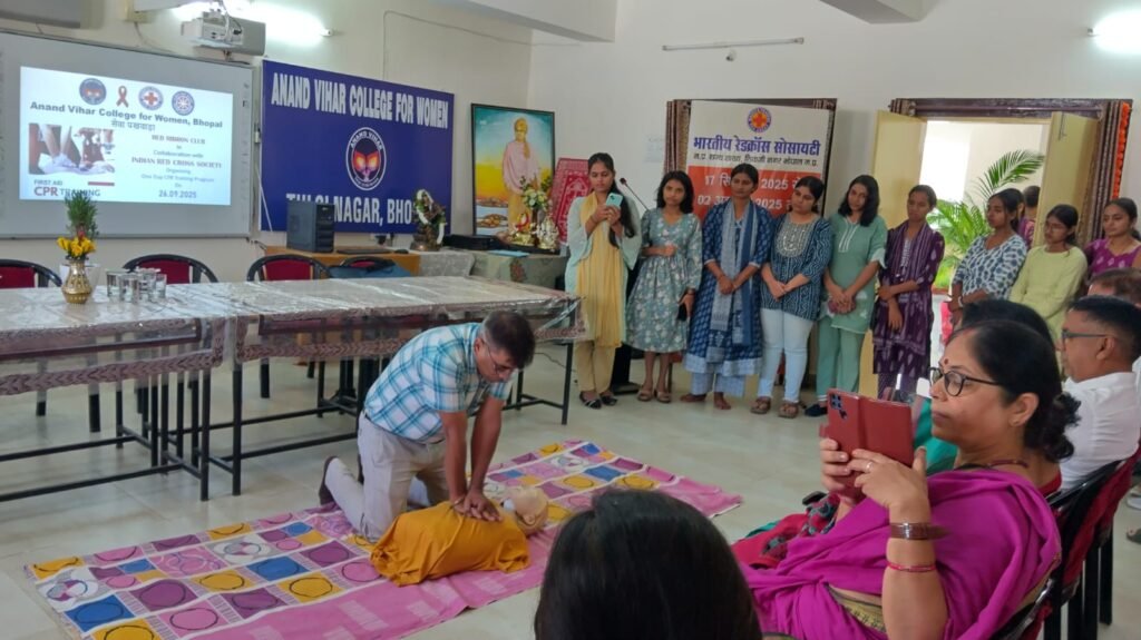 भारतीय रेड क्रॉस सोसाइटी मध्य प्रदेश राज्य सरकार द्वारा सेवा पखवाड़ा के अंतर्गत आज सत्य साइ कॉलेज कॉलेज के डायरेक्टर डॉ प्रतिभा सिंह,प्राचार्य डॉ अर्चना श्रीवास्तव एवं श्रीमती मालती जोशी के सहयोग से सभी छात्रों कुल  100 को सी.पी.आर. प्रशिक्षण दिया गया! इसी प्रकार आनंद विहार गर्ल्स कॉलेज की प्राचार्य श्रीमती मधु मिश्रा प्राचार्य एवं श्रीमती अनुपम पांडे के सौजन्य से सभी छात्राओं और स्टाफ कुल डेढ़ सौ लोगों को सी.पी.आर. ट्रेंनिंग दी गई l सी.पी.आर प्रशिक्षण देने का मुख्य उद्देश्य आपातकाल के समय हृदय गति बंद होने पर तत्काल सी.पी.आर प्रशिक्षित व्यक्ति के द्वारा सहयोग देना l जिससे कि उसकी जान को बचाया जा सके यथाशीघ्र सुरक्षित चिकित्सालय उपचार तक पहुंचाया जा सके l उक्त कार्यक्रम यूथ रेड क्रॉस के राहुल कुमार चौबे जूनियर रेड क्रॉस के श्री दिनेश आर्य जी एवं डॉक्टर सत्येंद्र बघेल प्रोग्राम कोऑर्डिनेटर द्वारा आयोजित कार्यक्रम को संपादित किया गया l