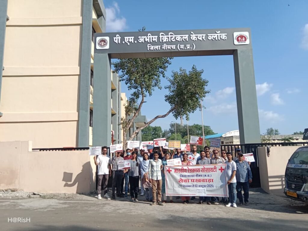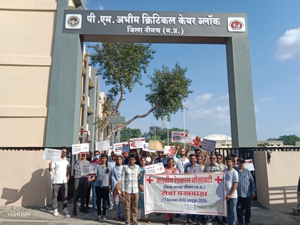 नीमच । कलेक्टर एवं अध्यक्ष श्री हिमांशु चंन्द्रा, जिला पंचायत सीईओ एवं प्रशासक  श्री अमन वैष्णव के मार्गदर्शन एवं डिप्टी कलेक्टर एवं सहा. प्रशासक श्री पराग जैन के निर्देशन में भारतीय रेडक्रास सोसायटी नीमच द्वारा 17 सितम्बर 2025 से 02 अक्टुबर 2025 तक सेवा पखवाड़ा का आयोजन किया जा रहा है। सेवा पखवाड़े के अंतर्गत संस्था द्वारा पिड़ीत मानवता की सेवा हेतु कई जन हितेशी कार्यक्रमों का आयोजन किया जा रहा है।